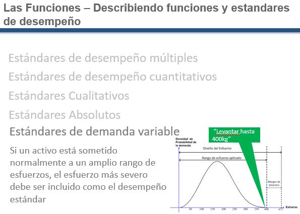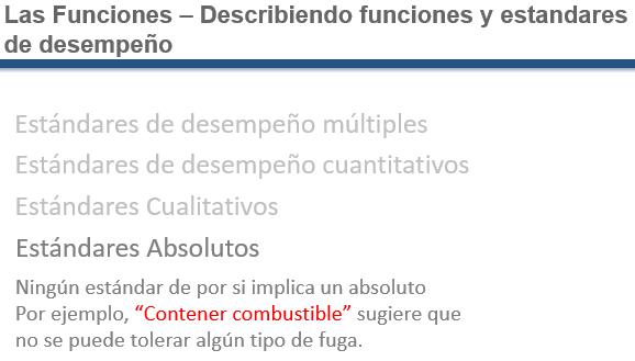 Performance standards are built into the function statement for one reason: to make it obvious what failed states can arise. Failures will speak directly to a performance standard in the Function statement. Th following slides illustrate the different types of performance standards that asset users may specify. Maintainers will agree to preserve function to the levels expressed by the performance standard.