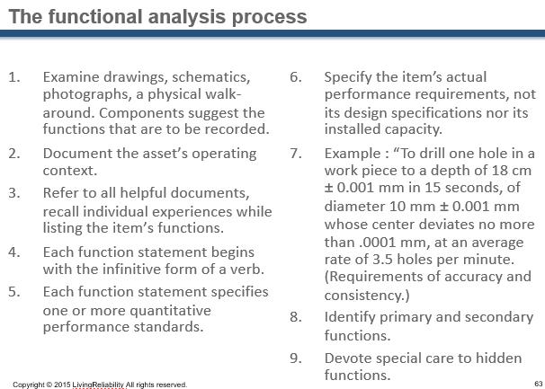 RCM may be thought of as a language of precision where various terms and concepts are narrowly defined. These five topics embody the functional analysis process. The anatomy of an RCM analysis begins with a set of precision grammatically structured function statements that specify quantitative performance standards. The asset functions to be preserved by maintenance are defined by the users’ requirements of the asset in its operating context. Each of these five topics will be discussed in the subsequent slides.