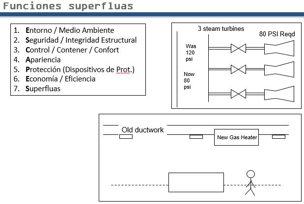 Superfluous functions refer to components that were installed at one time in the past for one (an original) operating context but no longer used in another (new context). Often, it is said that the redundant equipment is more expensive to remove, and it is decided to leave it where it is. However, these functions may still fail, (a fact that is often overlooked) and thus still need to be documented in the RCM functional discovery and subsequent analysis.