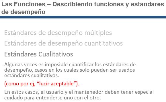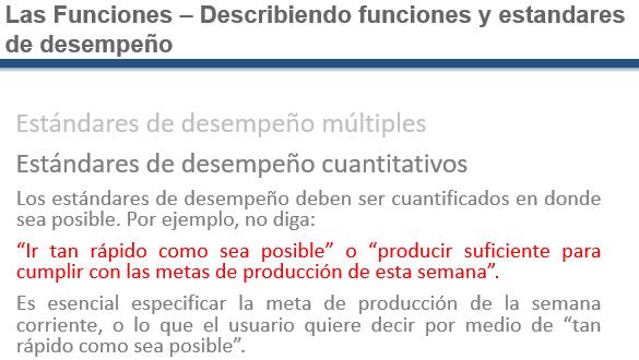 Always nail down a number in the performance standard as much as possible. To be able to push the office chair with a five lb force. Quantify your performance expectations, which is difficult in many cases. If operations can’t tell us exactly what they want they can’t hold us responsible for delivering it. [2]