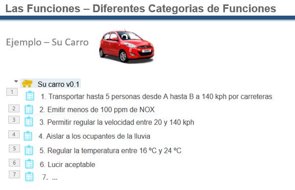 The function statement now reads “To get from A to B at speeds up to 85 mph”. We ask subsequently, “Is there anything (in that function statement) that distinguishes our car from a motor bike?” The function statement once again is amended to “To get a driver and up to 4 passengers from A to B at speeds up to 85 mph”. We might at this point ask, “Is there anything (in that function statement) that distinguishes a car from small helicopter?” Answer, “ … while traveling along paved roads” (as opposed to cross country). And so on.