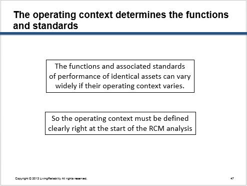 It is important to consider the operating context of the equipment, because this determines its functions, associated quantitative performance expectations and consequences of failure. The consequences of failure ultimately govern the selection of maintenance tasks.