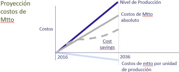 Cost is indeed important, so much so that we will project costs over the next 20 years. In the average production plant, will volume rise or fall over the next two decades? Rise. Globalization and rationalization resulting in the closing of less efficient operations will cause production in the remaining plants to rise. What about the absolute cost of maintenance? Will it rise or fall? It will also rise. Perhaps not at the same rate. The inflection in the dashed curve indicates taking advantage of economies of scale and improvements in efficiency.