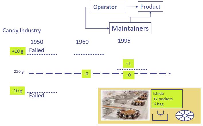 Animation: Packing candies into a bag. In 1950 250 g tolerance +- 10g defined failure. 1960s: trade regulators came along to spoil the party. 250 + 10g -0 were the new limits defining failure. A hopper with a crude simple spring loaded mechanical dumper met this requirement. It was easy to fix when it broke. Who came along to spoil this party – the accountants.