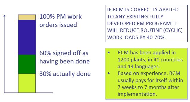 Cost in maintenance is fraught with contradiction. This is where we have to be so careful because we’re going to appear to contradict ourselves, with this declaration: “If RCM is correctly applied to any existing fully developed PM program, it will reduce routine (cyclic) workloads by 40-70%“.