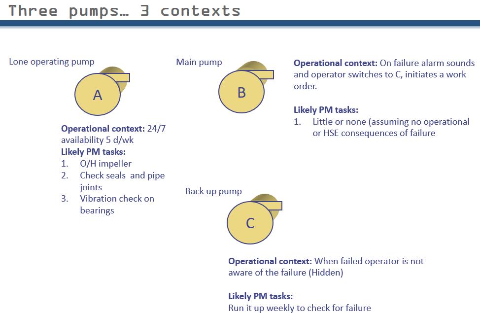 In fact we asked the wrong question. “Which pump matters the most?” We should have asked – “In what way does the failure matter?” So what if B fails – we switch to C and repair B. If that is the only consequence what maintenance program would we seriously consider? (note careful choice of words) Answer: run to failure. Key point – that is what you guys are telling me. You are telling me that identical pumps can have vastly different maintenance programs.