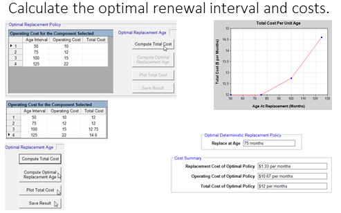 Surprisingly, the results are similar to those of the age replacement calculation. Why? Because the engines are operated continuously or consistently on a given calendar interval. That is the hours of operation do not vary significantly from one month to another. Hence it is not surprising that the interval replacement policy calculation results are similar to those of the age based replacement policy.