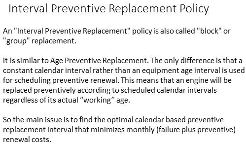When business conditions require a calendar based schedule for maintaining a group of items the Interval or block or group replacement policy must be adopted. Intuitively we would conclude that this policy would be more costly because it is less flexible. The analysis will lend evidence to the policy decision’s long term economic implications.