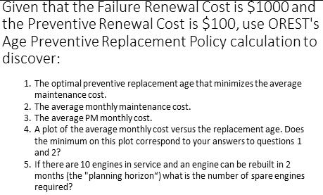 The turn around time for an engine rebuild once it arrives at the rebuild shop is two months. The cost penalty for failure in service is fixed at 1000:100.