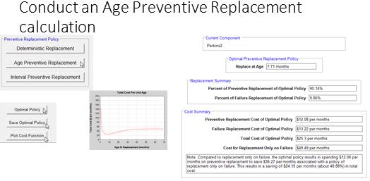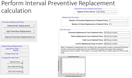 The report summarizes the percentages of preventive and reactive effort that will result by adhering to the optimal policy. Similarly the costs of PM and reactive maintenance are predicted to be $12 and $13 respectively. The cost versus replacement age graph approaches $49 asymptotically for for an infinite PM interval. That is to say, no PM.